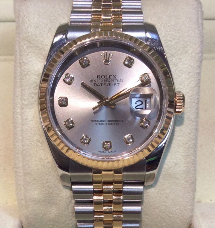 Bicolour Rolex Datejust model 116233 with smart silver / diamond dot dial on Jubilee 63603 bracelet. This watch has a random case number, suggesting it was first sold in the last five years or so. It comes with Rolex boxes, Datejust booklet, red swing-tag and our own warranty card. The NEW equivalent is now £8,600!