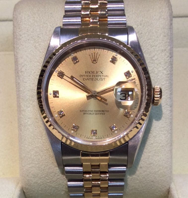 Bicolour Rolex Datejust model 16233 on Jubilee 62523 bracelet with classic champagne / diamond dot dial. This 1990 model is in lovely condition but we do draw your attention to very slight discolouration at the edge of the dial. It comes with Rolex 16233 boxes, an Oyster booklet, red swing-tag and our own warranty card. The NEW equivalent is now £8,600!