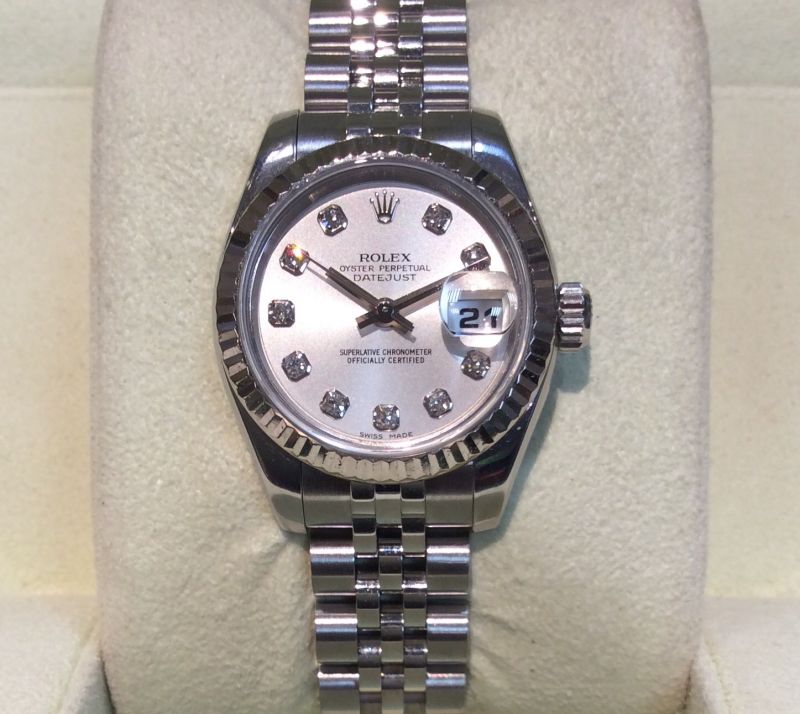26mm stainless steel and white metal Rolex Datejust model 179174 with sparkling silver / diamond dot dial on Jubilee 63130 bracelet. In lovely condition with Rolex boxes, Datejust booklet, red swing-tag and international Rolex papers dated March 2006. The nearest NEW equivalent model is now £7,300!