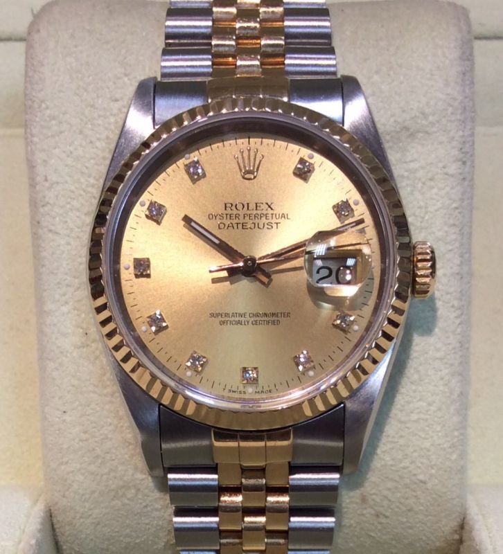 Bicolour Rolex Datejust model 16233 on Jubilee 62523 bracelet with classic champagne / diamond dot dial. This early 1990s model is in excellent condition, coming with later Rolex boxes, Oyster booklet, red swing-tag and our own warranty card. The NEW equivalent is now £8,600!