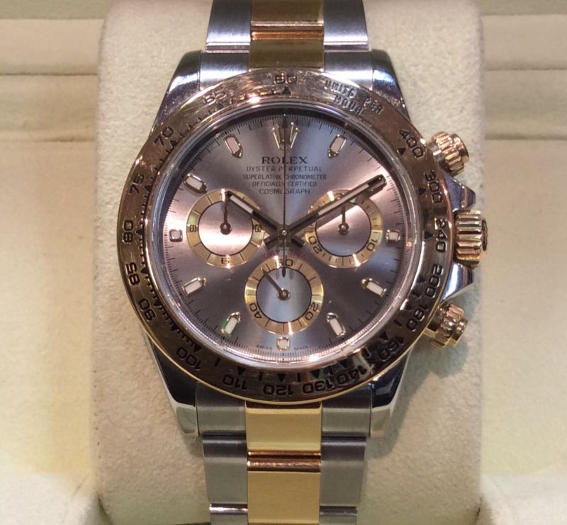 2016 watch! Bicolour Rolex Cosmograph Daytona model 116503 with smart silver-grey dial on Oysterlock 78593 bracelet. This is the revised model for 2016 with bezel markings slightly different from the 116523 which preceded it. Comes with both boxes, Daytona booklet, both swing-tags and international Rolex warranty card dated May 2016. In excellent condition although we do note some superficial marks on the glass. This is one of many Rolex professional models whose residual prices have risen sharply through lack of supply in recent years, so please be aware that its pre-owned price is not much below the NEW RRP of £13,000. That new price, however, may be less relevant if you can’t find one!