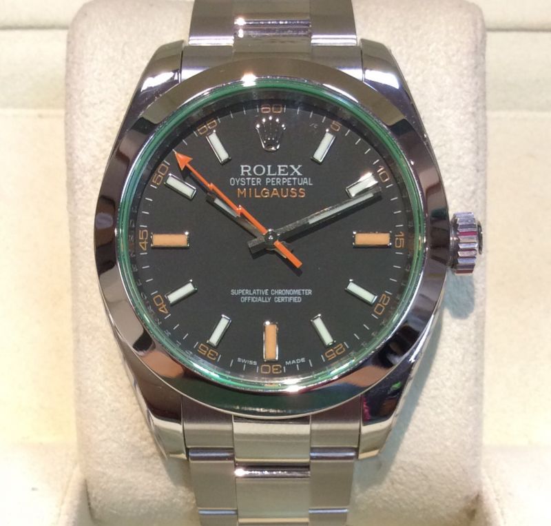 Fresh from Rolex UK service including a new glass in July 2016! Stainless steel Rolex Milgauss model 116400GV with black / orange dial, lightning bolt seconds hand and green-tinted synthetic sapphire glass, on Oyster 72400 bracelet. In wonderful condition (still in service stickers) with original boxes, Milgauss booklet, numbered green swing-tag, UK warranty card dated April 2009 and Rolex UK service warranty dated July 2016. The watch has just enjoyed an £893 overhaul including a new crown and glass, the latter of which seems to have an even more electrifying green hue than some of the early examples. The highly anti-magnetic Milgauss models were re-introduced into the Rolex range a few years ago and this particular version with its distinctive, green glass was always the most popular. The NEW RRP is now £5,500!