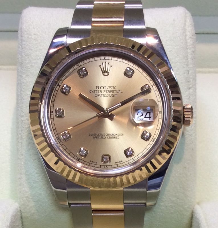 41mm steel and yellow metal Rolex Datejust II model 116333 with champagne / diamond dot dial on Oyster 72213 bracelet. Comes with both boxes, Datejust II booklet, red swing-tag and our own warranty card. This is a random case number watch so cannot be from earlier than 2010, though its condition suggests it may well be younger still. The last NEW RRP for this exact model was £10,050…while the new equivalent model 126333 is now £10,850! Be warned: this is a massive watch.