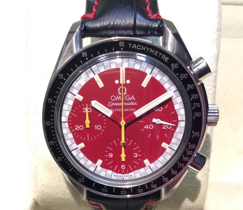 Gent's stainless steel Omega “Speedmaster Reduced,” believed to be model 3810.61.41. These automatic chronographs with brightly coloured dials were usually associated with special editions and Michael Schumacher. Originally fitted with a red strap, it now comes on a third party black strap with red stitching, but fitted on an original Omega pin-buckle. The case number suggests this watch is from the late 1990s; in very nice condition, it comes with an Omega box and our own warranty card. Phil or Paul in the Miltons watch team would be delighted to demonstrate the chronograph functions for you. Please note that (1) it is NOT a waterproof watch and (2) leaving the stop-watch running permanently on such a watch can affect its time-keeping.