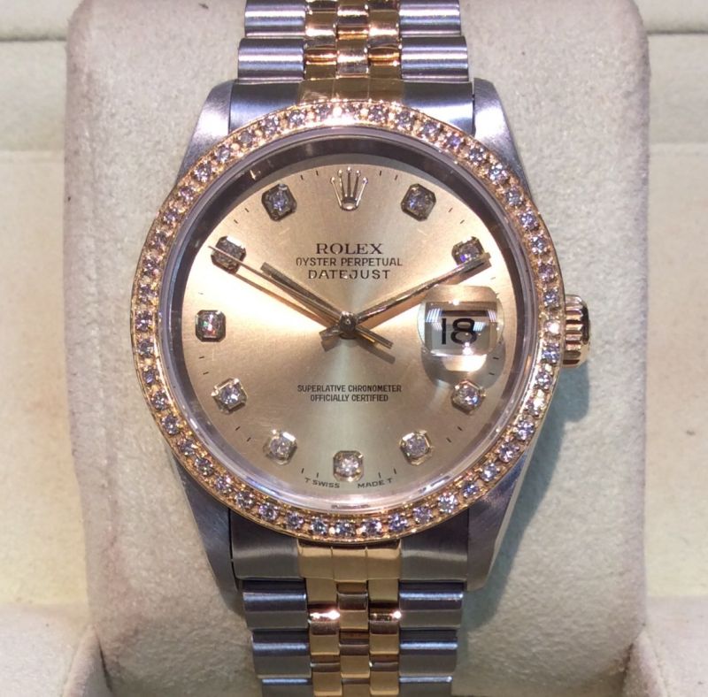 Bicolour Rolex Datejust model 16233 on Jubilee 62523 bracelet with champagne / diamond dot dial (in the later style, with rounded settings) and a diamond-set bezel which has been custom-made, NOT by Rolex. As loyal devotees to the Rolex brand we are not great fans of customised pieces and will not supply such parts to customer request, but when our pawnbroking departments are left with one that is already fitted there always seems to be a queue of buyers! This 1996 model shows moderate signs of age / wear and comes with a Datejust booklet, red swing-tag, our own box and warranty card.