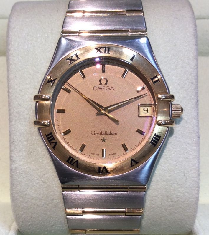 Gent's steel and yellow metal Omega Constellation '95 quartz bracelet watch with textured champagne / baton dial, believed to be model 1212.10.00. In fine condition with only superficial wear to the glass, this watch comes with Omega boxes, instruction book, specification sheet and our own warranty card. Available from Miltons of Church Street, Liverpool city centre.