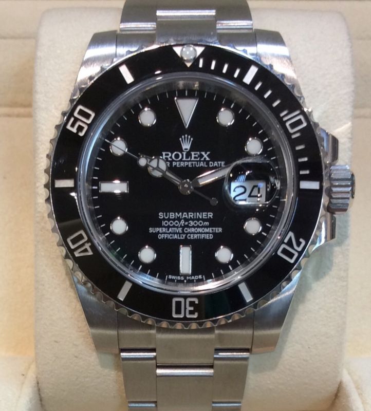 Available today with NO silly nonsense about the warranty card being withheld*! Stainless steel Rolex Date Submariner model 116610LN with black dial and ceramic bezel insert on Oyster Glidelock 97200 bracelet. In excellent condition, it comes with both boxes, Submariner booklet, numbered green swing-tag and USA warranty card dated July 2015! The NEW RRP of this popular model is £6,550 but this is one of several steel professional models that can now be very hard to obtain new, so we are selling it at a small premium. Clearly if you can find one at RRP then you should buy it. Good luck! Available from Miltons of Chester, under the famous clock.