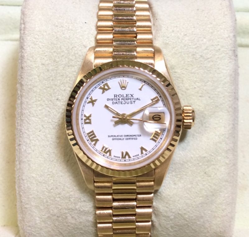26mm Rolex Datejust in 18ct yellow gold, model 69178 with bright white / roman numeral dial on President 8570 bracelet. This late 1980s model is in very pleasing condition and comes with original, large Rolex box (in worn condition, with generic sponge rather than the original cushion), Datejust booklet, a Rolex UK service slip from April 2005, our own warranty card and a certificate from the ALR Watch Register confirming that we checked it with them. The NEW equivalent is now £18,900!