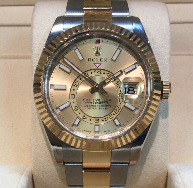 Available today: December 2017 UK watch! 42mm bicolour Rolex Sky-Dweller model 326933 with champagne / index baton dial on Oyster 72223 bracelet. Ask for our Rolex-trained specialists Phil or Paul to discuss this watch with you. Like the Rolex Daytona, it seems that a Rolex with complicated functions can prove exceptionally popular. In excellent condition, it comes with original boxes, Sky-Dweller booklet, both swing-tags, UK warranty card dated December 2017 and even the delivery bezel protector. The NEW RRP is now £14,150 but these models are not always readily available.