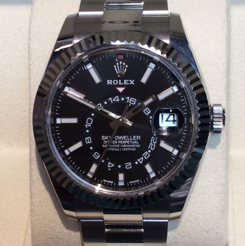 Available today: MINT UK watch from August 2019 with BOTH swing-tags and NO silly nonsense about the warranty card being withheld*! 42mm stainless steel and white metal Rolex Sky-Dweller model 326934 with black / index baton dial on Oyster 72220 bracelet. Formerly part of a large collection, the watch appears hardly to have been worn. As with the Rolex Daytona, it seems that a steel Rolex with complicated functions can prove exceptionally popular. We are selling it at a premium to the list price. Ask for our Rolex-trained specialists Phil or Paul to discuss this watch with you. Comes with original boxes, Sky-Dweller booklet, both swing-tags, UK warranty card dated August 2019 and even the delivery bezel protector. The NEW RRP is £11,100 and clearly if you could obtain one for that price then you should. Good luck!