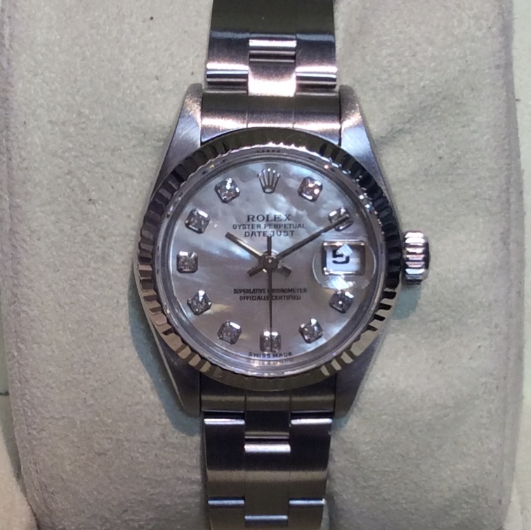 26mm stainless steel and white metal Rolex Datejust model 69174, fitted with a new Oyster 78240 bracelet some years ago. Has simply gorgeous white mother-of pearl / diamond dot dial in the newer style with larger settings. Comes with Rolex boxes, Datejust booklet and original UK papers from Watches of Switzerland in Bournemouth dated April 1997. The NEW equivalent is now £8,750!