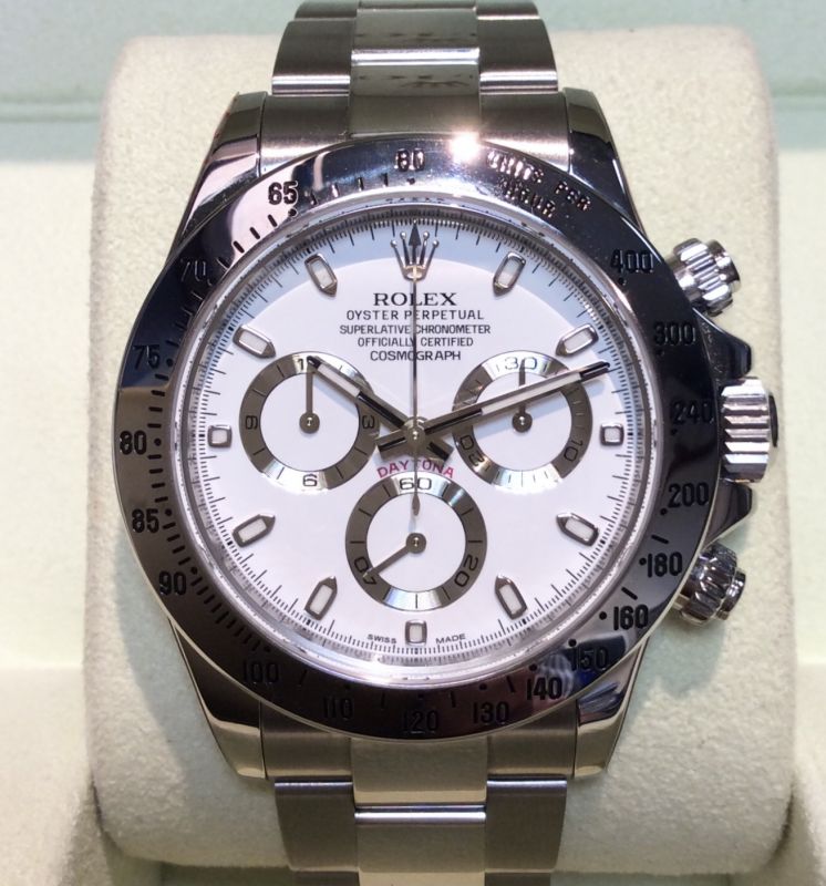 2014 Daytona, fresh in stickers from Rolex UK service ! Stainless steel Rolex Cosmograph Daytona model 116520 with white dial on Oysterlock 78590 bracelet. Has Rolex boxes, Daytona booklet, Rolex UK service card dated August 2019 and a certificate from the ALR Watch Register confirming that we checked it with them. This random case number watch is in superb condition having just had £925 of service work including a new glass! While it no longer has its original warranty card, we have seen this watch previously and noted that it was first supplied in Canada in August 2014. The NEW ceramic bezel models now have an RRP of £10,500 but “waiting lists” are generally closed and that version is commonly being sold on the secondary market for around £19,000. This has made the 116520 an extremely attractive purchase and it remains in its own right one of the most sought after models.