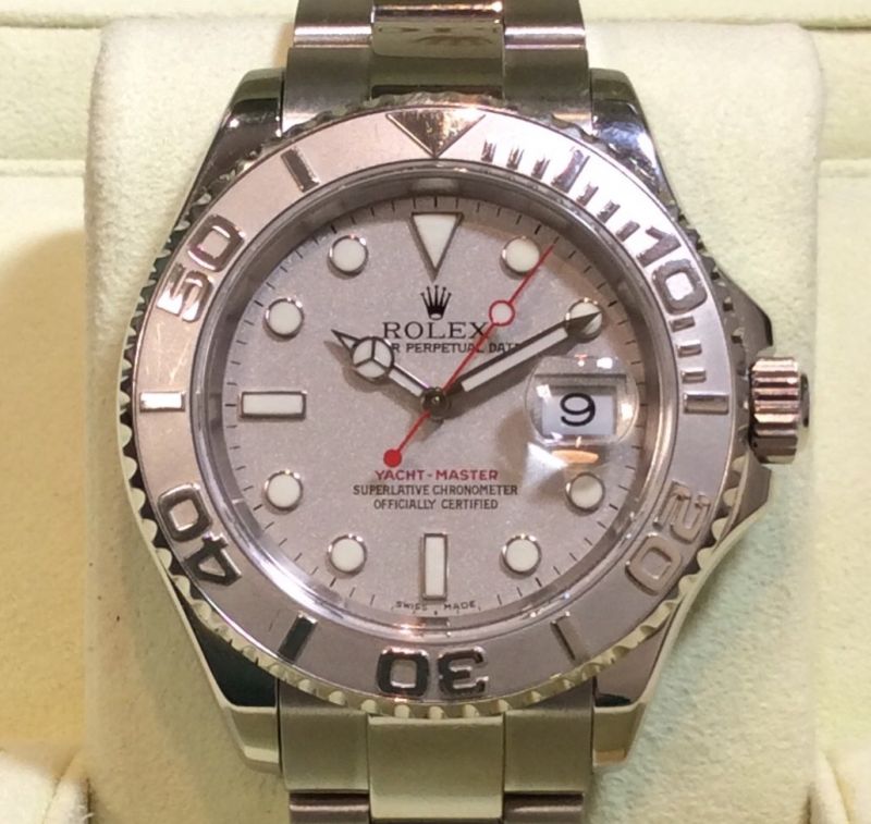 Gent’s full size Rolex Yachtmaster model 16622 in Rolesium, with silvery dial on Oysterlock 78760 bracelet. Has Rolex boxes, Yachtmaster booklet and UK papers from David M. Robinson dated November 2003. In excellent condition but we do note some lights marks to the bezel. The new equivalent is now £9,550!