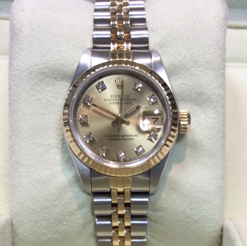 26mm bicolour Rolex Datejust model 69173 on Jubilee 62523 bracelet with sparkling champagne / diamond dot dial. In very pleasing condition but does show some signs of age / wear to the bracelet, dial and box. Comes with original Rolex boxes, Datejust booklet, UK papers from Alexanders the Jewellers dated Decembers 1991, numbered green swing-tag and our own warranty card. The nearest NEW equivalent is now £9,250!