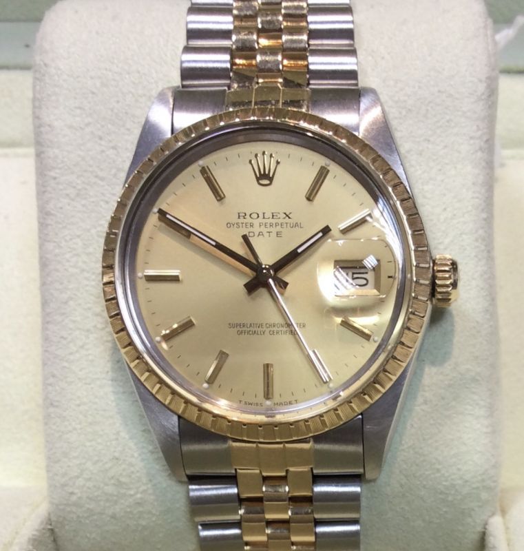 34mm bicolour Oyster Perpetual DATE model 15053 from approx 1987, with champagne / baton dial on Jubilee 62523 bracelet. This watch is in surprisingly nice condition for its age and is powered by the 3035 calibre movement which introduced the useful, quick-set date-change feature. It has been fitted with a replacement acrylic glass that is not by Rolex. It comes with our own presentation box, warranty card and a certificate from the ALR Watch Register to confirm that we checked it with them. Please note that in general we no longer guarantee acrylic glass models like this to be water-resistant.