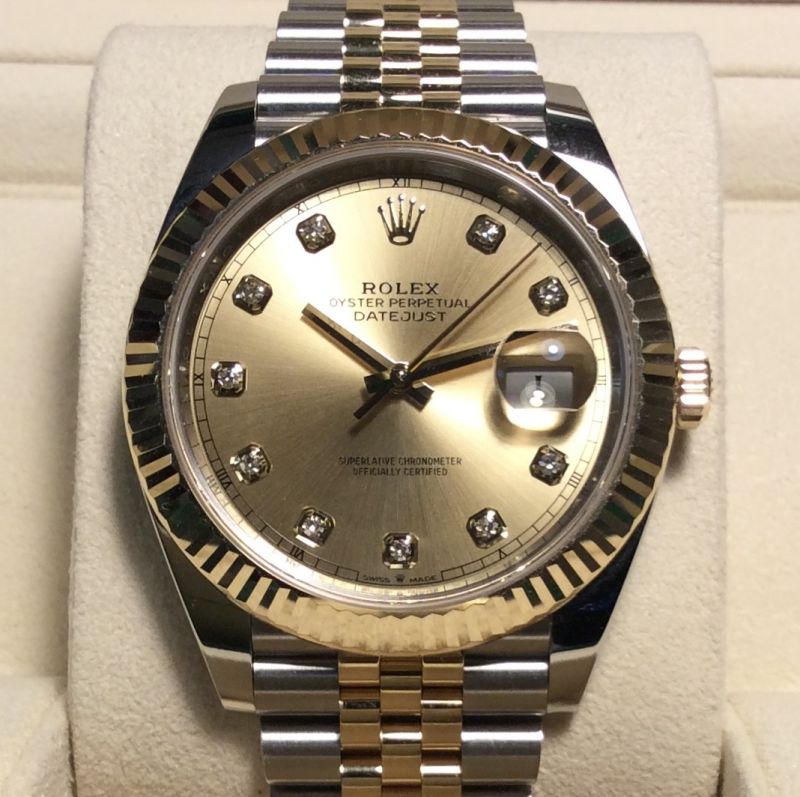 October 2020 watch, latest model! Stainless steel and yellow metal Rolex Datejust 41, model 126333 on Jubilee 62613 / articulated clasp bracelet with sparkling champagne / diamond dot dial. This is the large, 41mm model with both boxes, Datejust booklet, both swing-tags and UK warranty card from The Watches of Switzerland Group (Goldsmiths in Liverpool) dated October 2020. The NEW RRP is now £12,150! Available from Miltons of Church Street, Liverpool city centre.