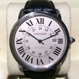 £1,099 Stock number: 10-57-00142mm (extra large) stainless steel Ronde Solo de Cartier, automatic strap watch model W6701010, case reference 3517 with smart silver / roman numeral dial. In lovely condition, it comes with a Cartier box and our own warranty card. Please note (1) the leather parts of the strap have been replaced with alligator supplied by a third party, not Cartier (2) this is NOT sold as a water-proof watch (3) such Cartiers are essentially very stylish DRESS watches; the automatic movements inside them are rarely perfect time-keepers and can seem noisy when the self-winding rotor turns (4) we would normally advise that anything between – 10 to + 15 seconds per day should be expected on these models, even after a service, but regular winding can help to moderate this. The NEW RRP is now £2,770.