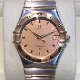 £1,099 Stock number: 11-63-052Gent's steel and yellow metal Omega Constellation '95 quartz bracelet watch with textured champagne / baton dial, believed to be model 1212.10.00. In fine condition with only superficial wear to the glass, this watch comes with Omega boxes, instruction book, specification sheet and our own warranty card. Available from Miltons of Church Street, Liverpool city centre.