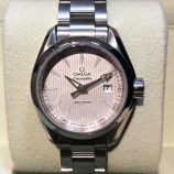 £999 Stock number: 20-70-020Lady's delightful stainless steel OMEGA Seamaster Aqua Terra quartz bracelet watch, current model 231.10.30.60.02.001 with pin-stripe silver / arrow index dial. Comes with lovely Omega presentation box, instruction book, Omega specification sheet and our own warranty card. The NEW RRP is now £1,840.