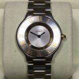 £899 Stock number: 50-33-00631mm bicolour Cartier Must 21 quartz bracelet watch, case reference 1330 with silver dial. Shows moderate signs of age and general wear, including to the exposed, flat bezel (as is very common). Comes with original box, instruction booklet and papers.